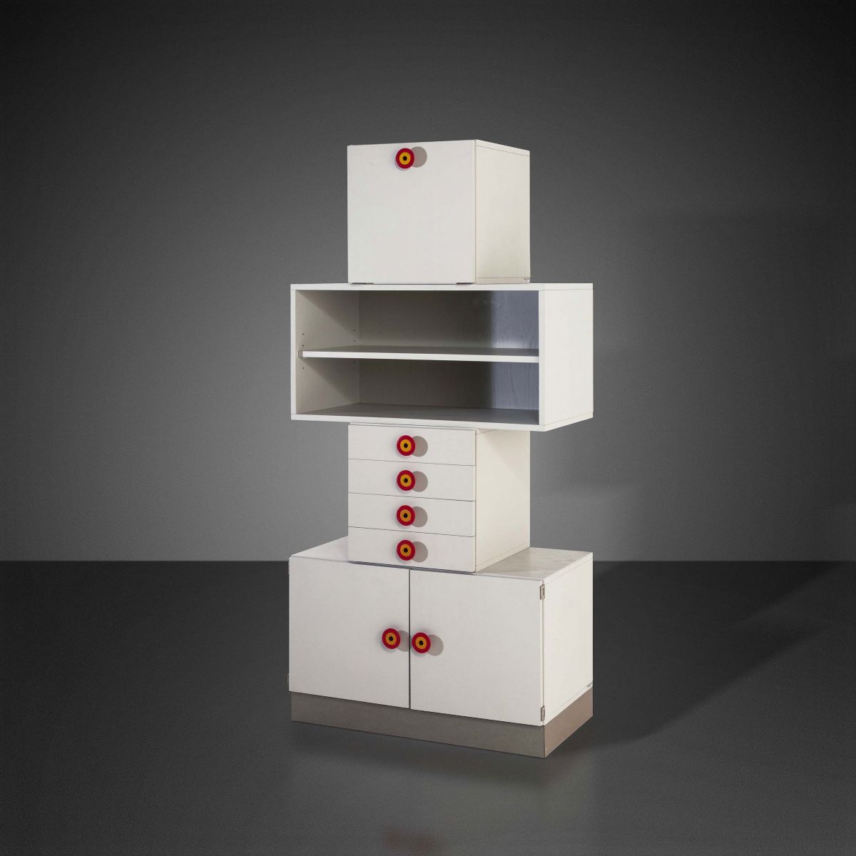 Mobile contenitore della serie Cubirolo con struttura in legno laminato e legno laccato. Dettagli in materiale plastico.