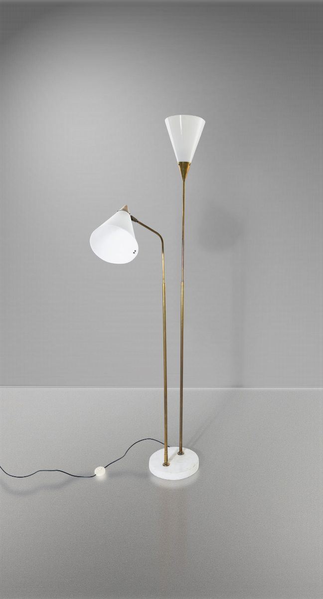 Lampada da terra con struttura estensibile in ottone e metallo laccato. Base in marmo. Diffusori orientabili in perspex.