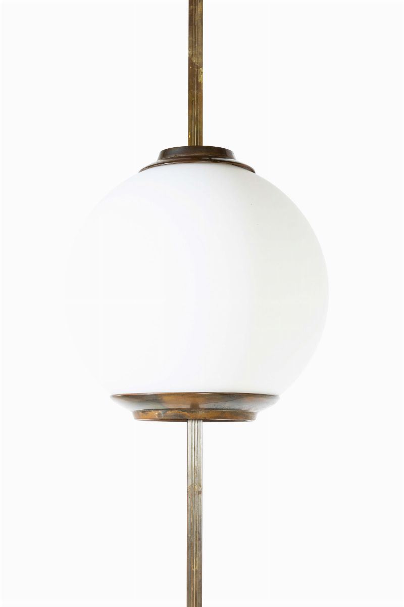 Lampada da terra modello Lte 10 con diffusore in vetro opalino, struttura in ottone lucido e base in marmo.