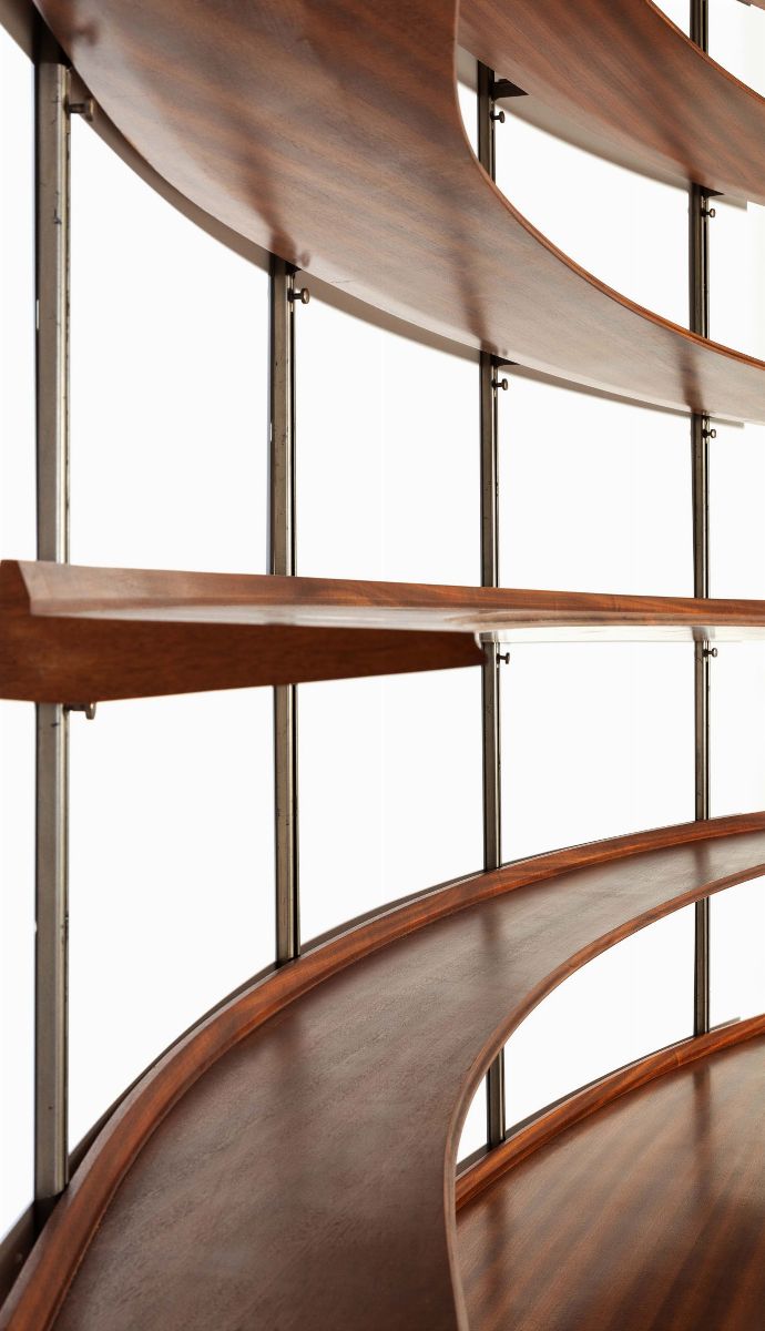 Grande libreria modulare curva con binari a muro in metallo e ripiani in legno. Disegno originale per gli arredi dell’Università Statale di Milano.