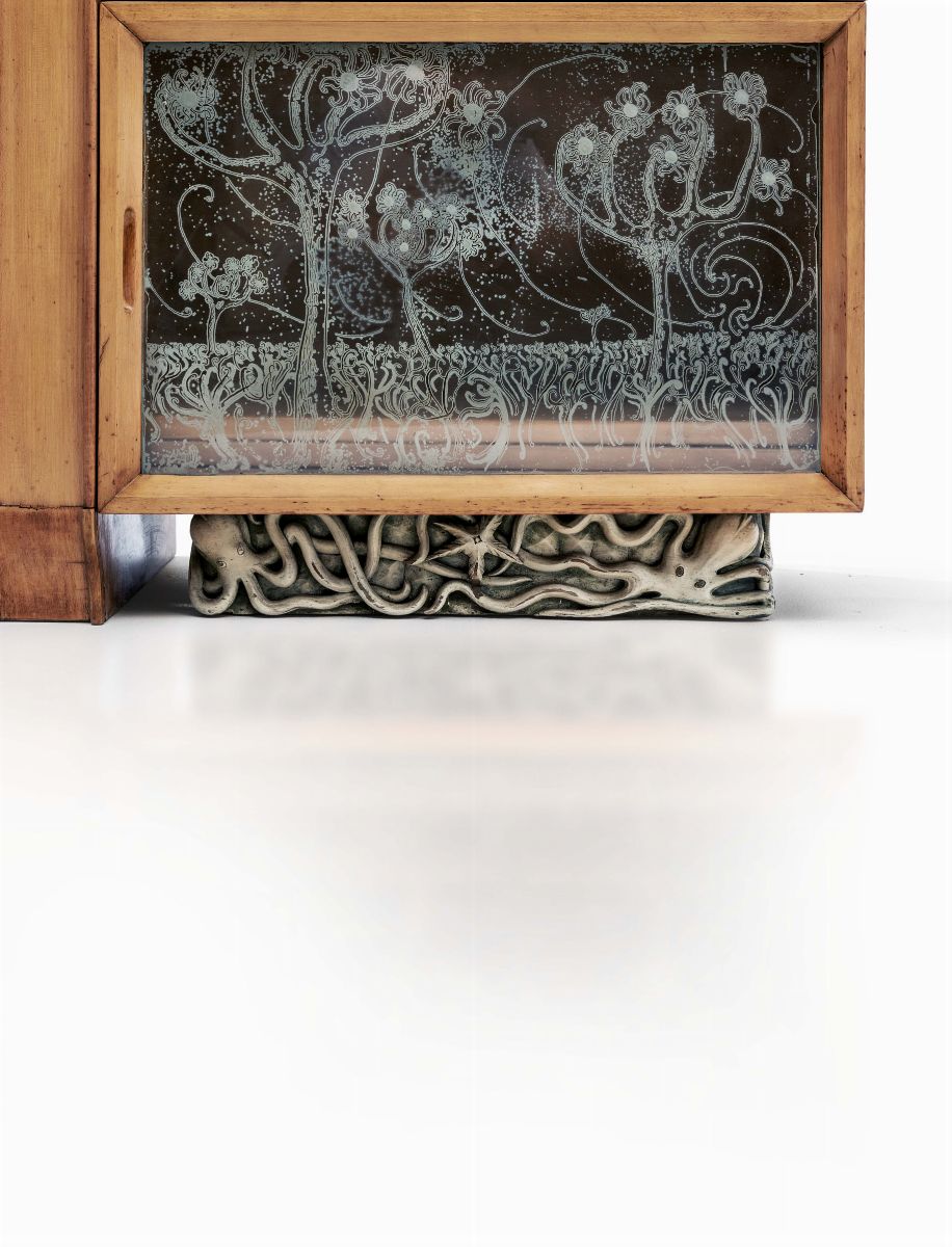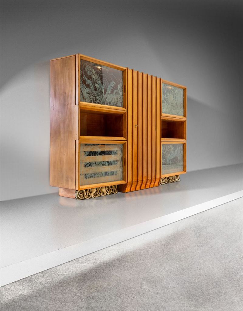 Grande credenza con struttura in legno. Vetri con decoro acidato e sostegni in legno intagliato e laccato. Interni in vetro specchiato. Etichetta originale.