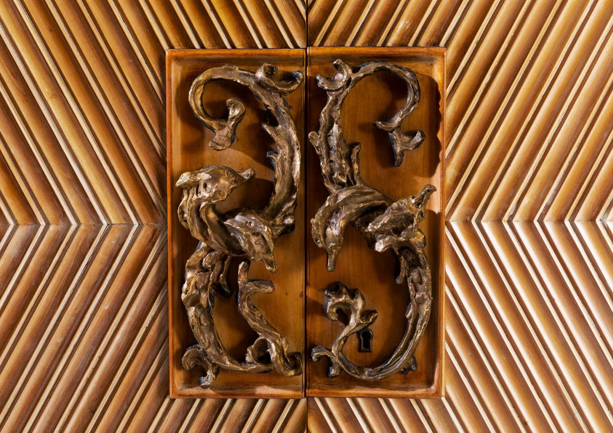 Armadio con struttura in legno e rivestimenti in legno grissinato. Maniglie in bronzo create da Lucio Fontana. Provenienza da una abitazione Milanese.