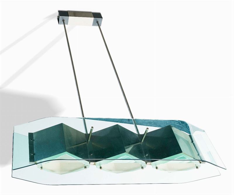 Lampada a sospensione con struttura in ottone e diffusori in vetro colorato curvato molato e vetro curvato satinato.