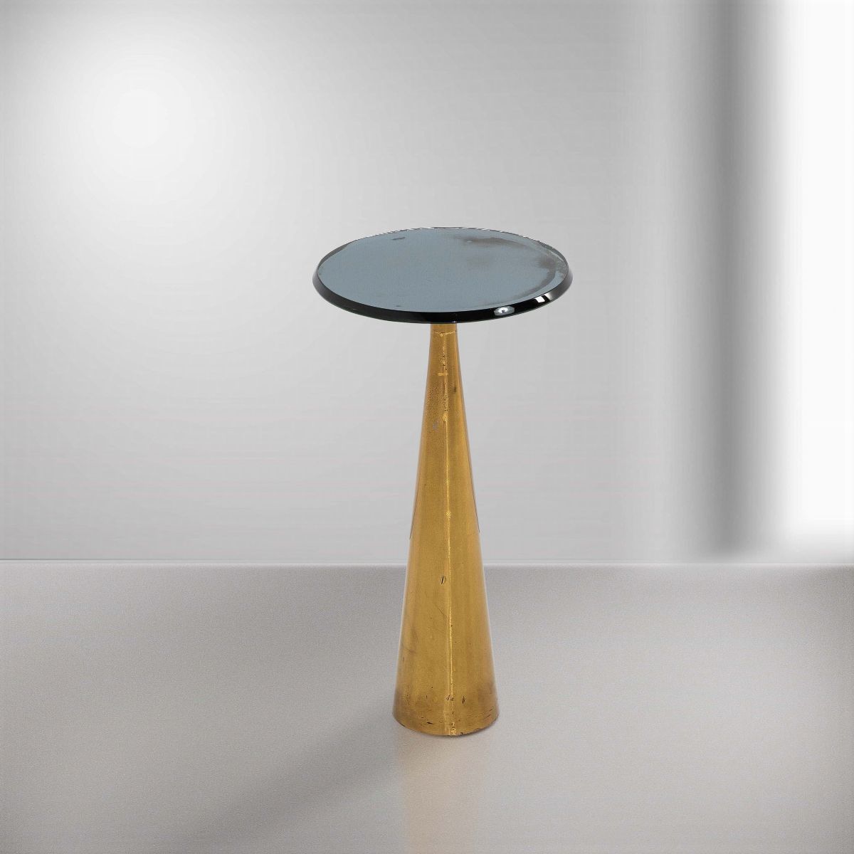 Tavolino d'appoggio con struttura in ottone e piano in vetro molato e specchiato.