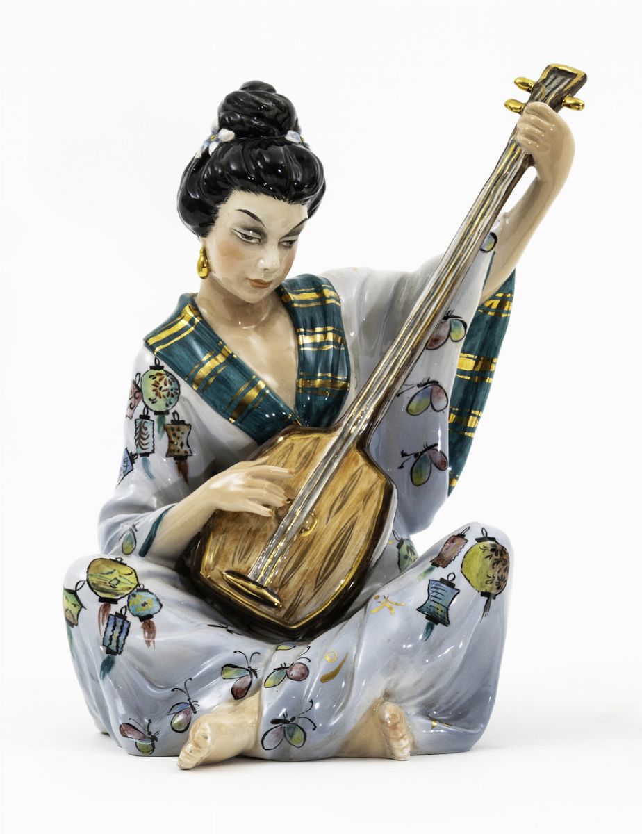 Figura di donna orientale intenta nel suonare un mandolino in terraglia a colaggio con decoro policromo.