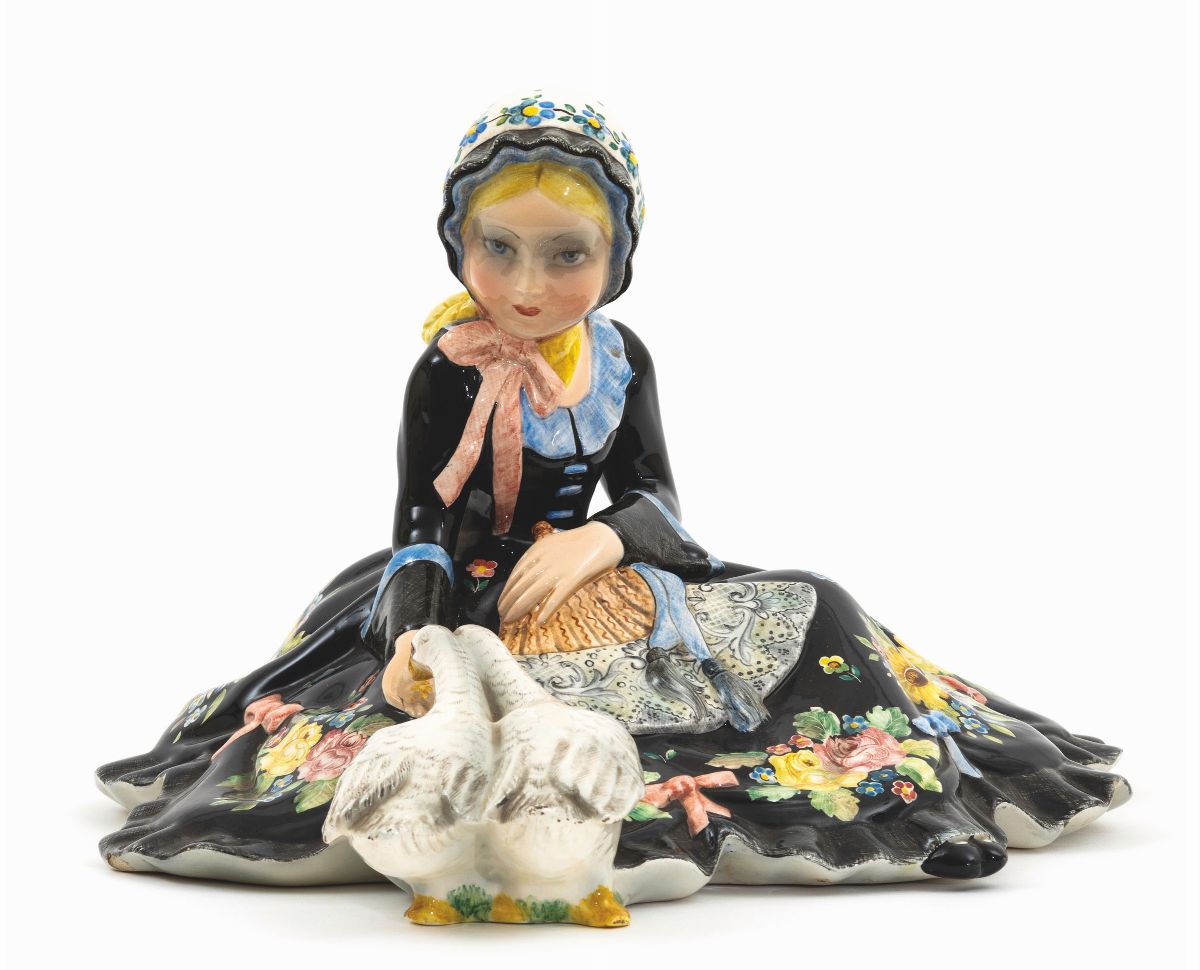 Figura femminile seduta con oche in ceramica a colaggio con decoro policromo.