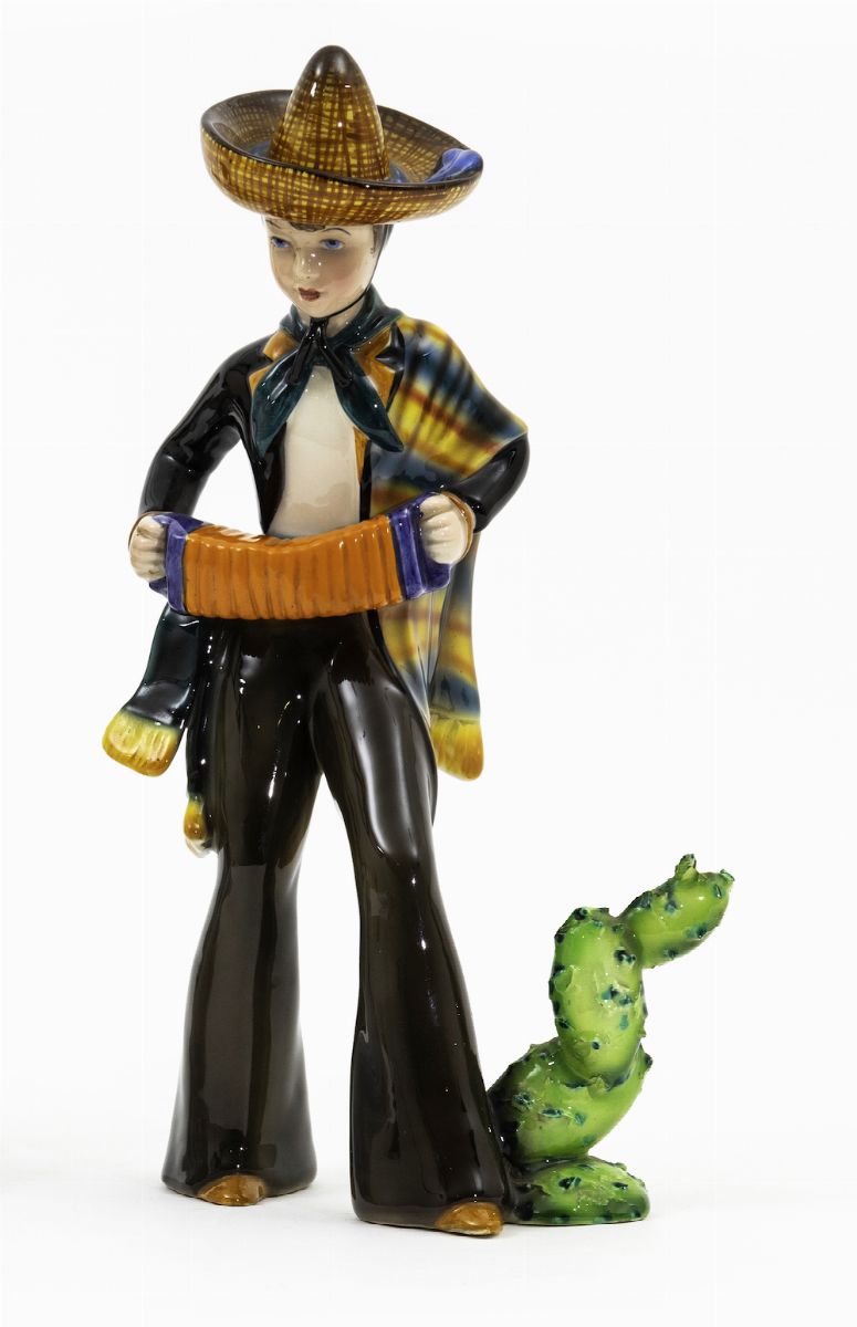 Figura di suonatore messicano in terraglia a colaggio con decoro policromo.