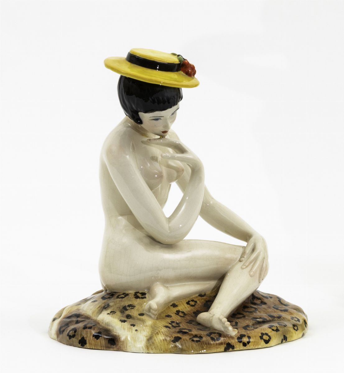 Figura di nudo su pelle di leopardo in terraglia a colaggio con decoro policromo.