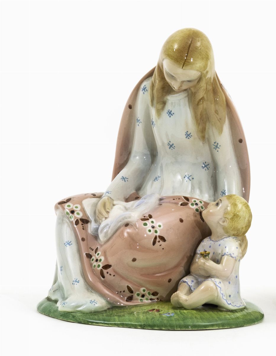Figura femminile con bambino raffigurante la Maternità in terraglia a colaggio con decori in policromia.
