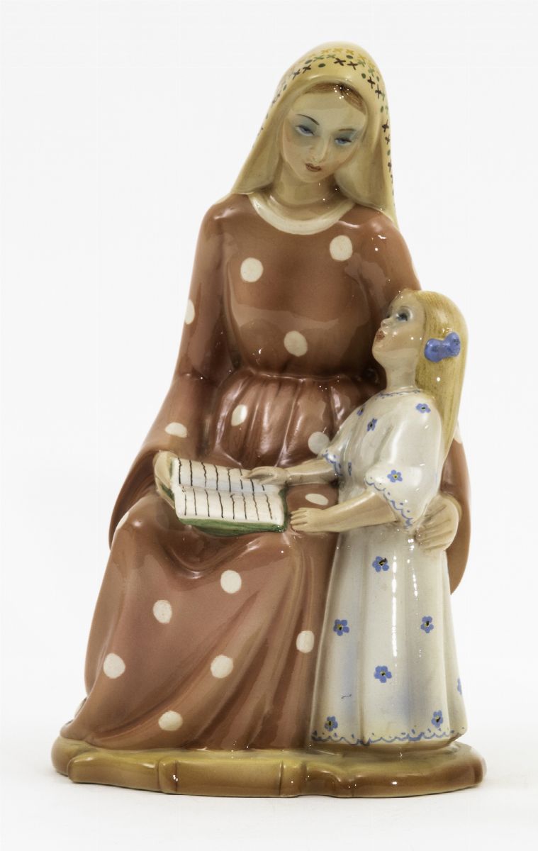 Figura di madre con bambino in terraglia a colaggio con decoro policromo.