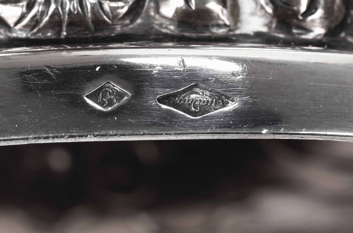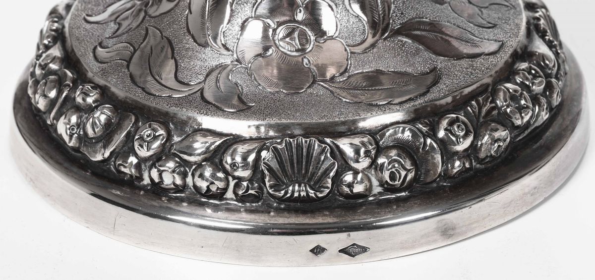 Molten, embossed, chiselled and engraved silver. Mid 1800s, stamps of silversmith Guadagni. 1640gr, H 32cm.