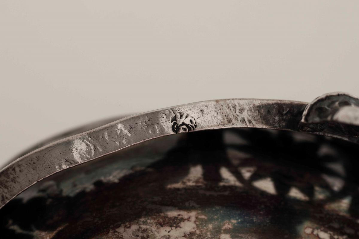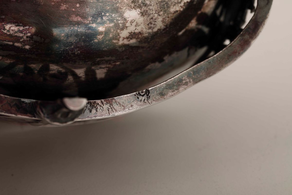 Embossed, chiselled and engraved silver. Guarantee stamp of the city. 170gr, 10.5x8x10.5cm