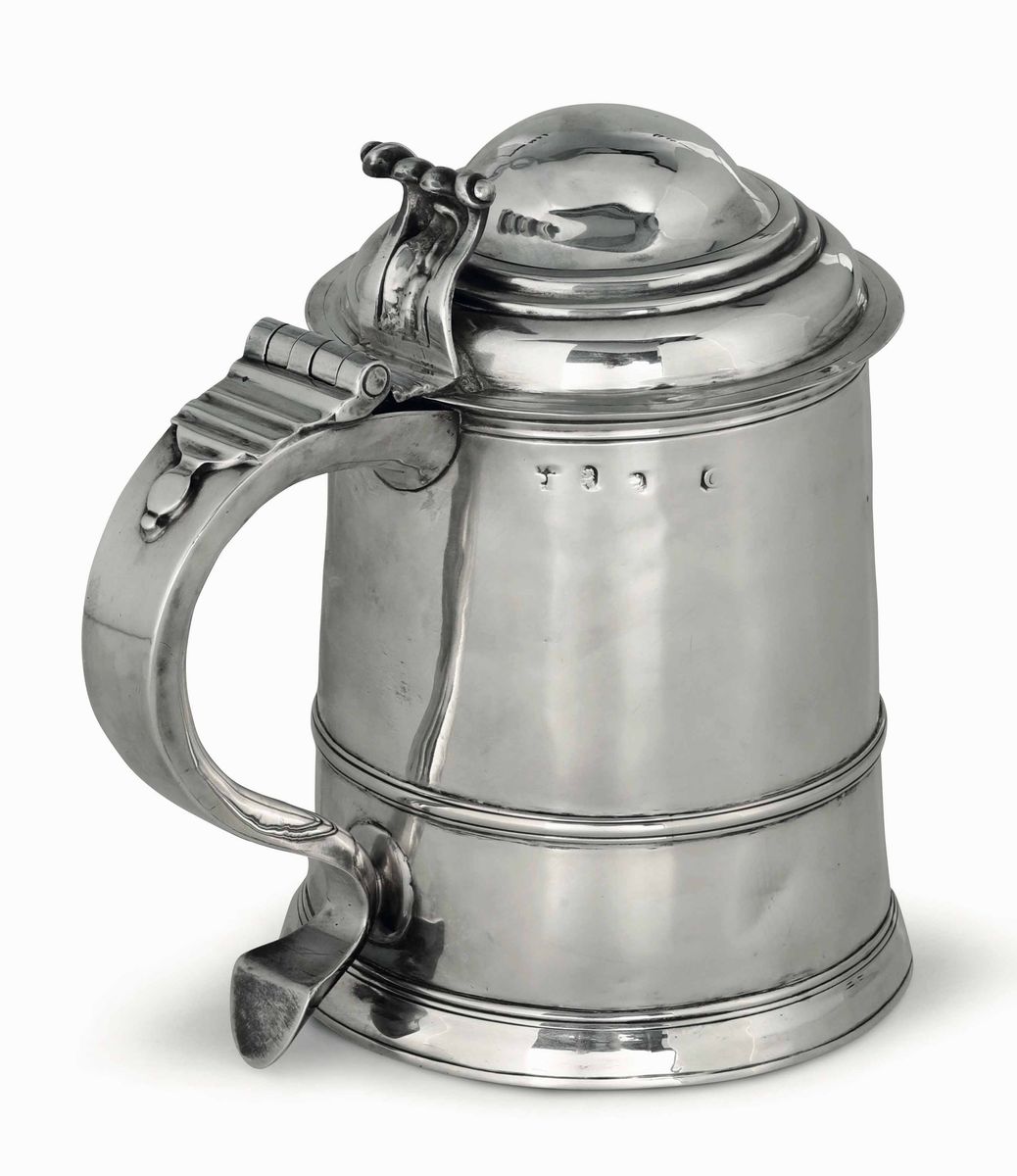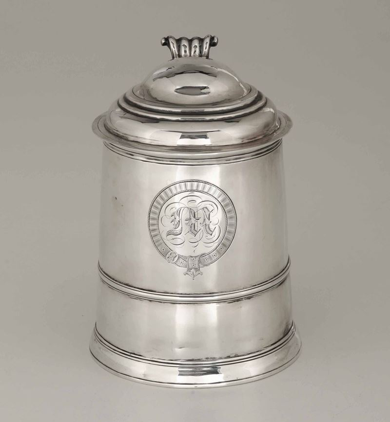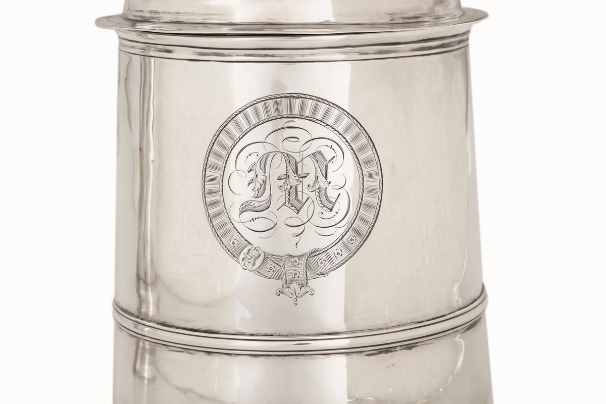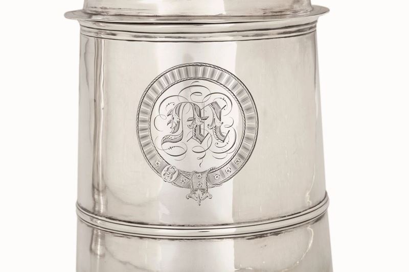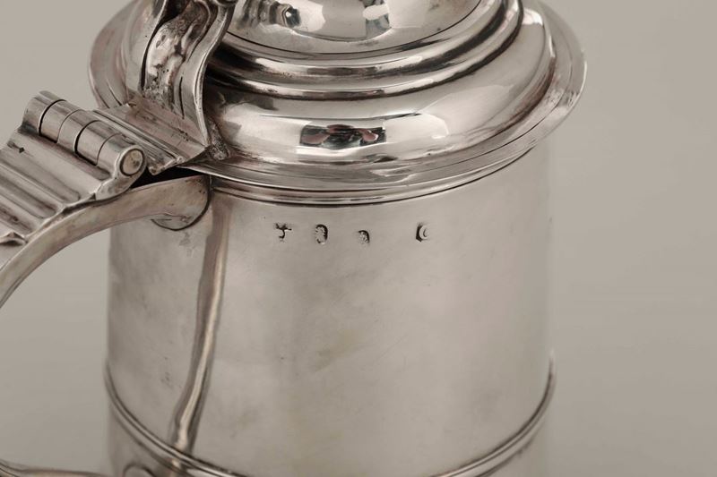 Molten, embossed and chiselled silver. Worn/unreadable silversmith's mark. 640gr, H 18cm