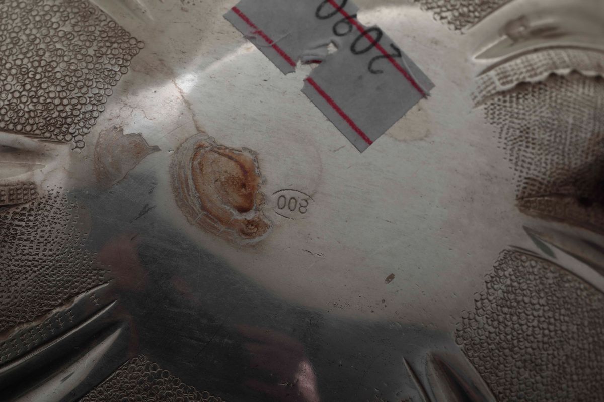 A set with tray in molten and chiselled silver. 4300gr, 33x45cm, H 22cm, 27cm, 12cm and 16cm.