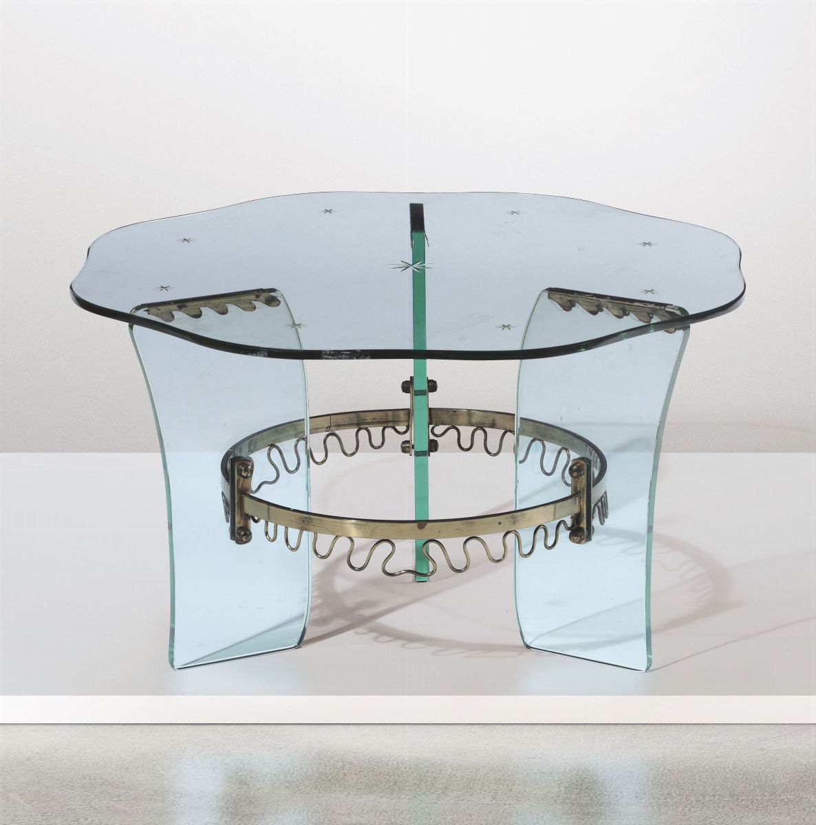 Cut crystal structure with brass details and a silkscreen-printed glass top. 77x43cm