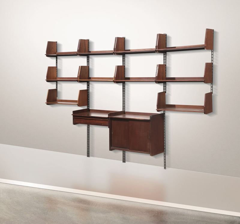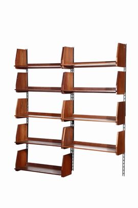 Metal structure of modular wooden shelves and cabinets. Eight modules available. 75x42x200cm
