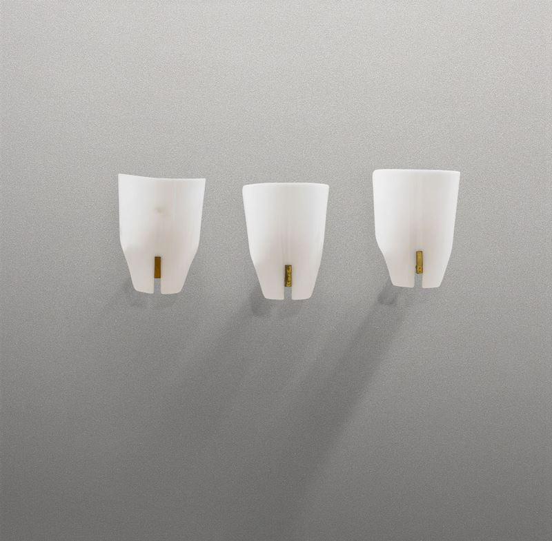 Tre appliques mod. 167px con struttura in ottone e diffusore in plexiglass.