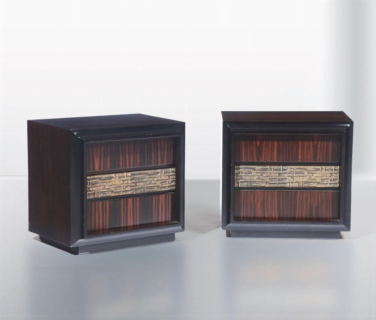 Coppia di comodini della serie Desiree con struttura in legno e inserti in fusione di bronzo cesellato.