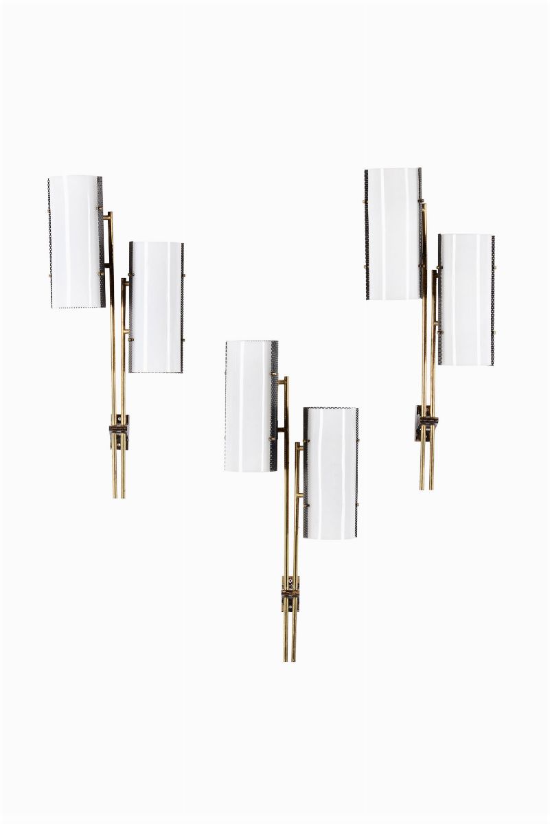 Tre appliques con struttura in ottone, metallo laccato e diffusore in plexiglass. Marchio originale.