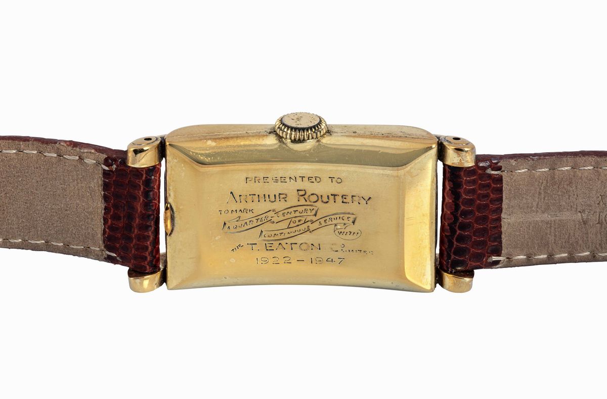 Raffinato e raro Rolex Prince Century Club 1/4 Eaton, referenza 3937, con cassa rettangolare curved in oro 14kt, movimento meccanico a carica manuale. Oltre alla forma i modelli Prince della Rolex si distinguono dagli altri orologi dell’epoca per l’indicazione dell’ora separata da quella dei secondi. Questa caratteristica ha dato il soprannome a questi particolari orologi di “doctor’s watches”, ovvero orologi per professionisti con la necessità di un controllo dei secondi più immediato (ad esempio la misurazione delle pulsazioni). La cassa si presenta con particolare disegno delle anse, e il meccanismo dell’orologio riempie tutta la cassa interna in modo che le ruote, i pignoni, il bilanciere e lo scappamento di altissima precisione dispongono di un largo spazio e possono svilupparsi come in un orologio da tasca di grandi dimensioni.