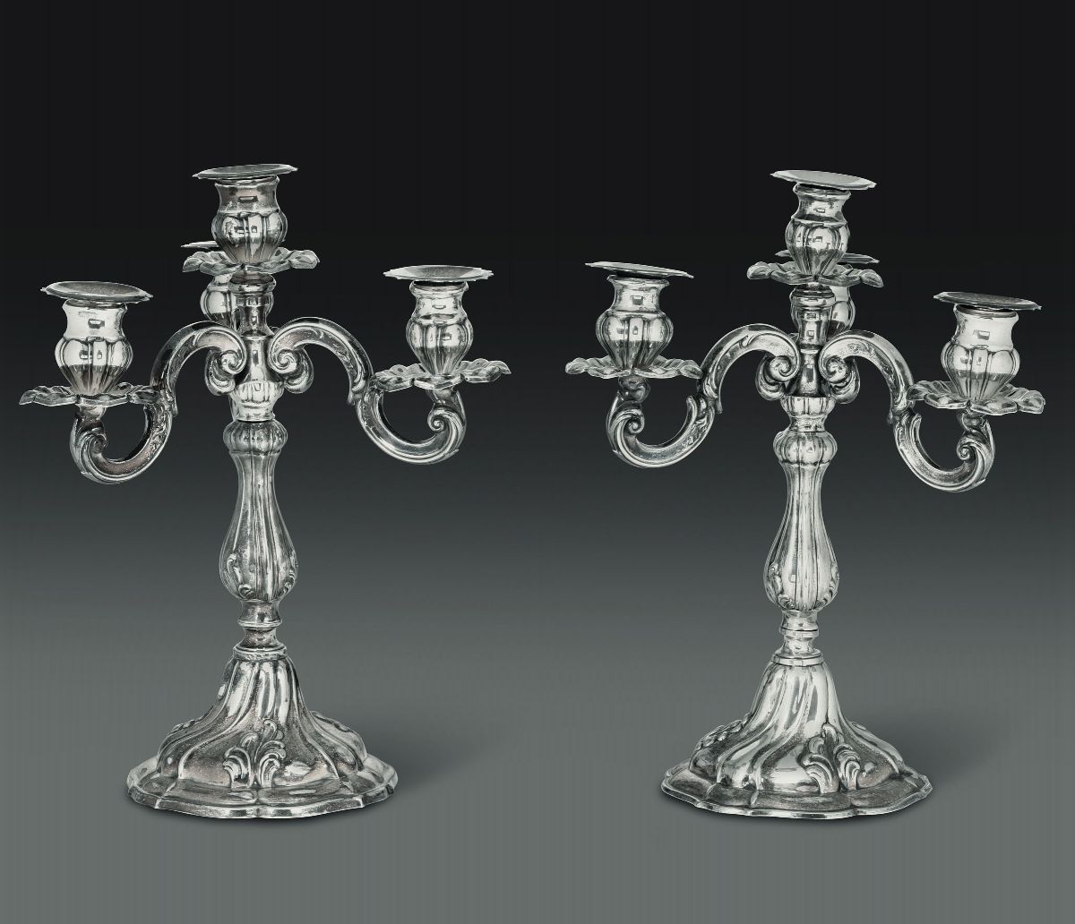 Coppia di candelabri a quattro luci in argento fuso e cesellato. Manifattura artistica italiana del XX secolo