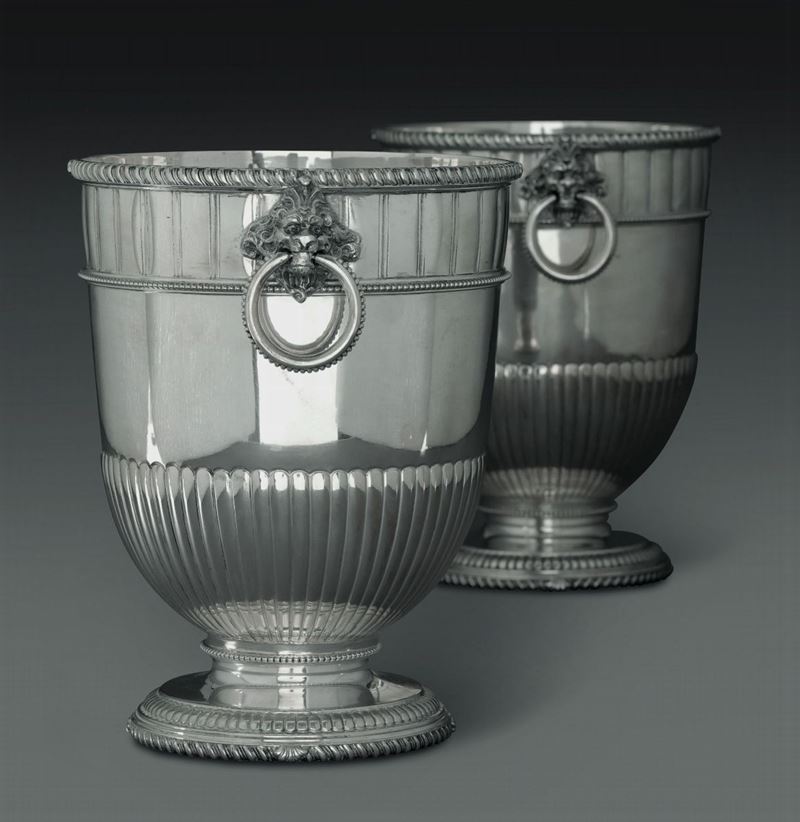 Coppia di secchielli porta bottiglie in argento. Argenteria artistica italiana. Bolli con fascio littorio in uso dal 1935 [..]