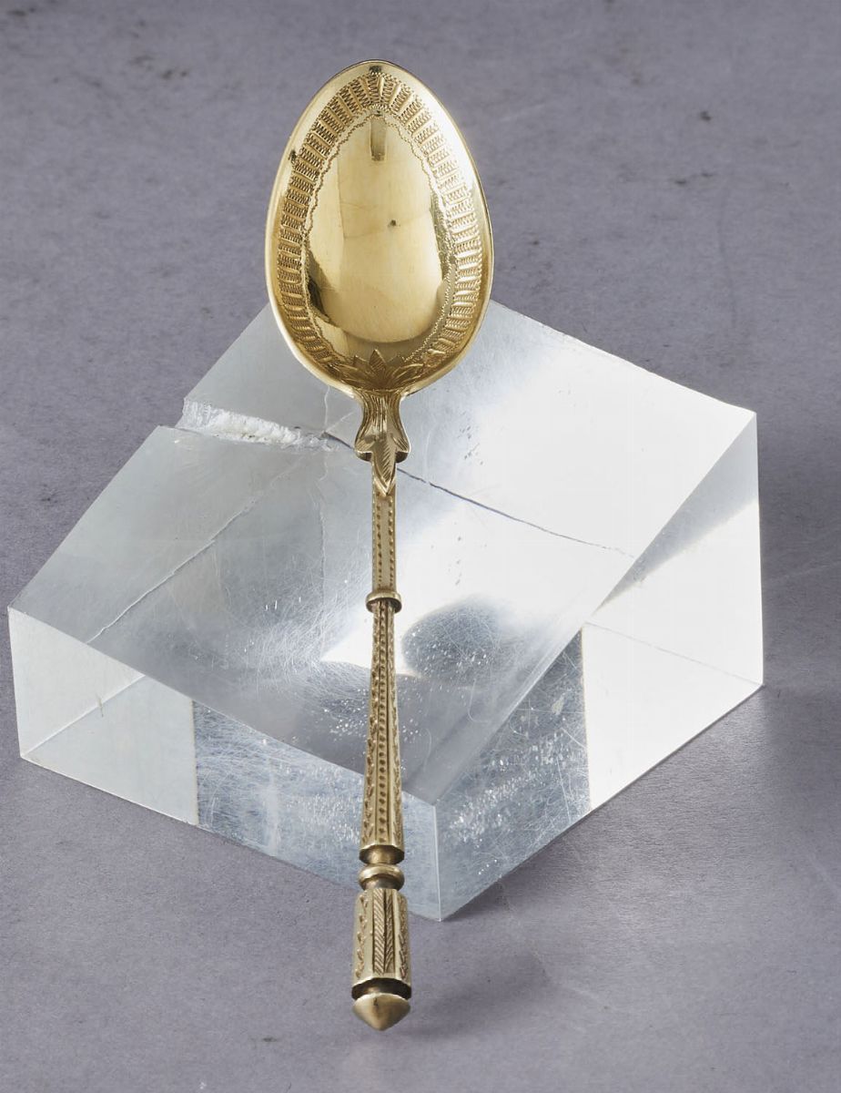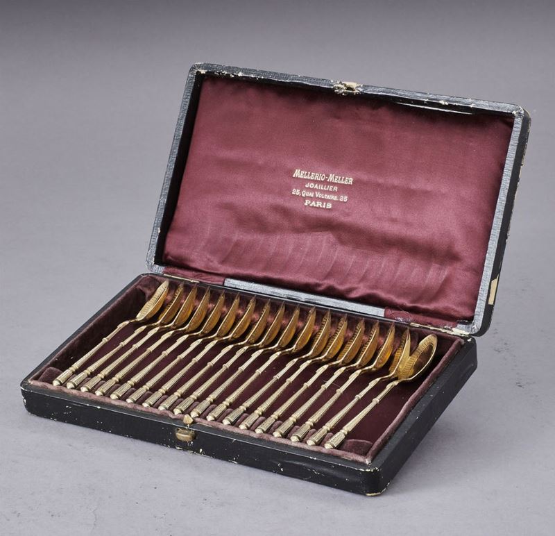 Diciotto cucchiaini in argento vermeille entro custodia. Argentiere Mellerio, Parigi
