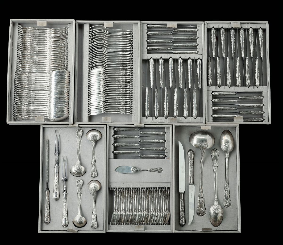 Importante servito di posate in argento fuso e cesellato. Londra 1813-14. Orafo Paul Storr (1771-1844)