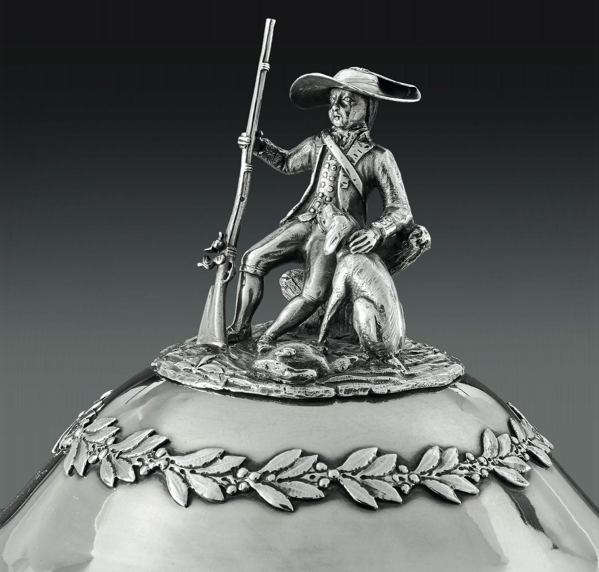 Forma sferica biansata con eleganti decori a foglie di quercia e festoni intrecciati, piedi a ricciolo nervato e presa con gruppo a tuttotondo raffigurante cacciatore seduto con cane