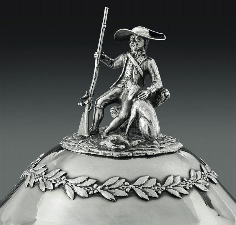 Importante zuppiera con presentoire in argento fuso, sbalzato e cesellato. Francia (?) ultimo quarto del XVIII secolo