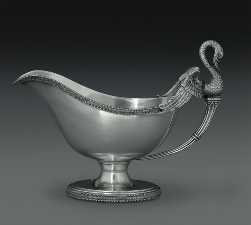 Salsiera in argento presa a cigno. Argenteria italòiana del XX secolo. Argentiere Ricci, Alessandria
