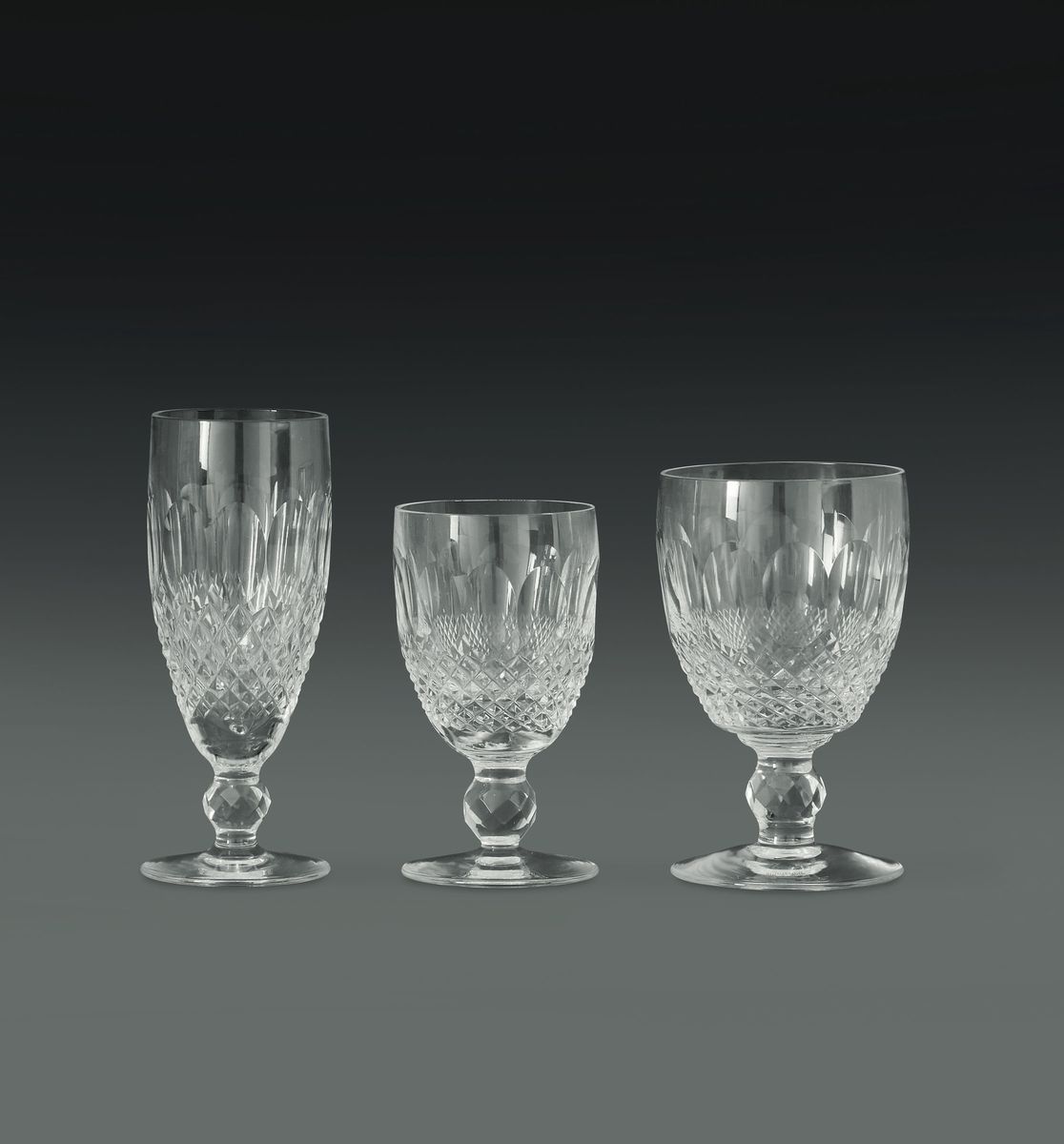 Cristallo. Marca: “Waterford” incisa all’acido. Ottimo stato di conservazione; esclusi 1 calice da vino e 1 flûte con sbeccatura al bordo e 1 flûte con felatura La fabbrica nasce nel 1783 ma è costretta a chiudere alla metà dell’Ottocento a causa dei gravosi dazi inglesi. Un immigrato cecoslovacco riapre la manifattura nel 1947 che oggi appartiene al gruppo comprendente Waterford Crystal, Wedgwood e Royal Doulton
