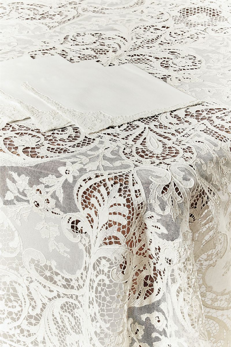 Tovaglia in merletto di Burano completa di 16 tovaglioli, fine XIX secolo inizi XX secolo