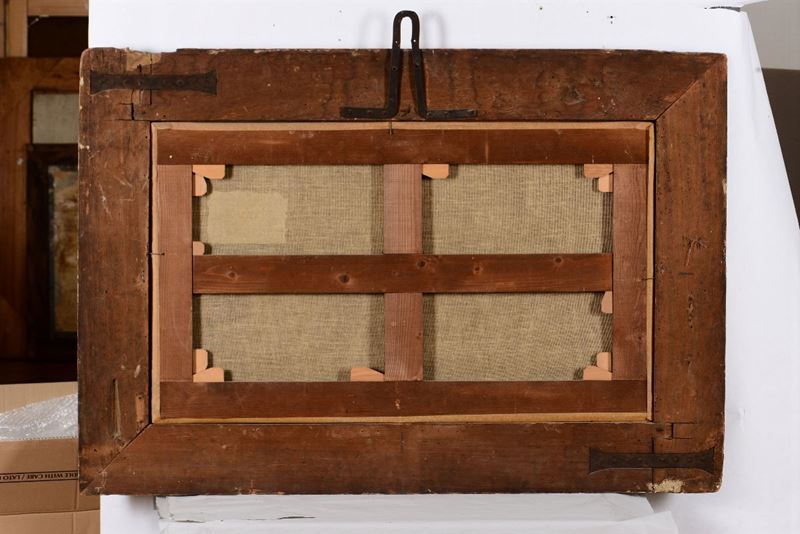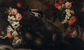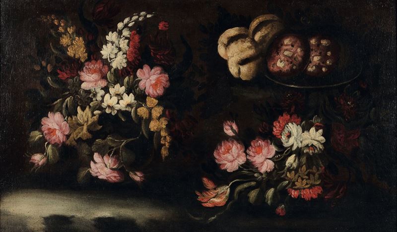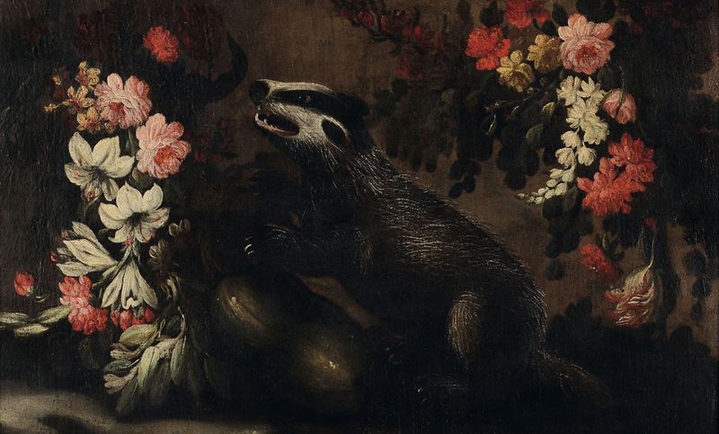 Giuseppe Pesci (Parma ?-1722), attribuito a Natura morta con vasi di fiori e tasso