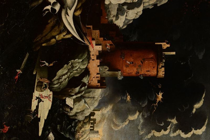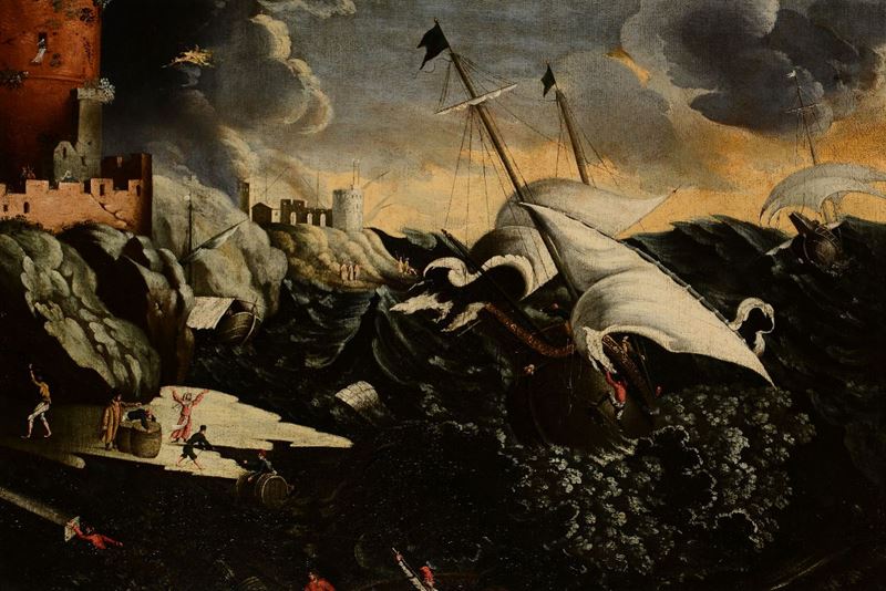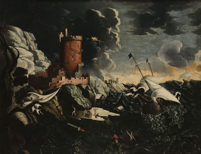 Scuola del XVII secolo Mare in tempesta con naufragio