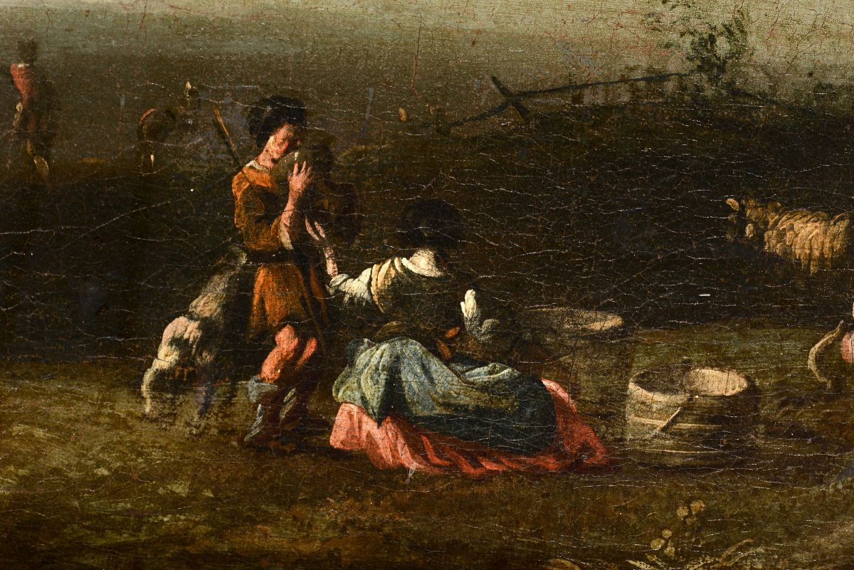 Scuola del XVIII secolo Paesaggio costiero con pastori, armenti e rovine sullo sfondo