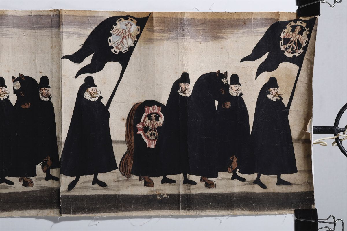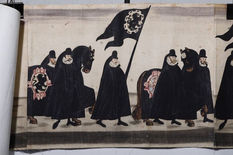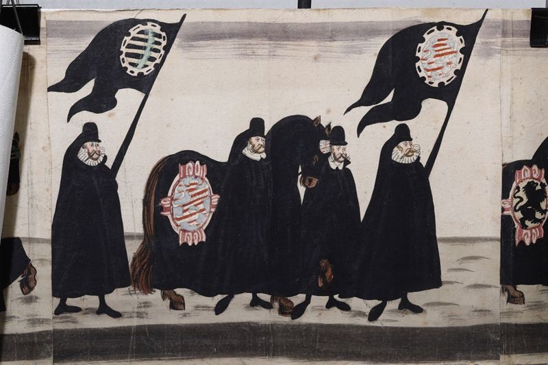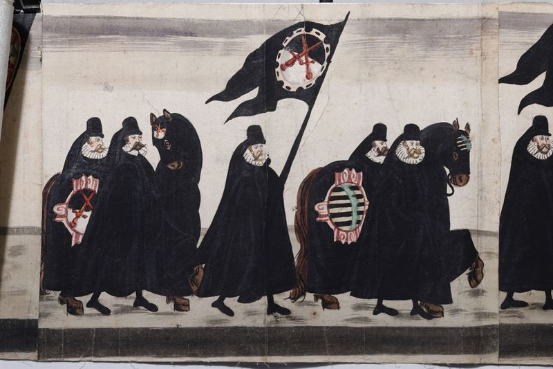 Scuola tedesca del XVII secolo Corteo funerario con cavalli e stendardi