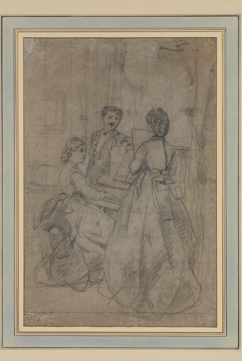 "Il disegno raffigurante la 'Lezione di piano' è un importante esempio della grafica di Lega; per l'impaginazione ricorda la tela 'Il canto di uno stornello' del 1867. Il foglio quadrettato è probabilmente preparatorio per un dipinto non ancora rintracciato. Anche lo studio particolareggiato della mano nella parte alta del disegno è a favore della nostra tesi."
