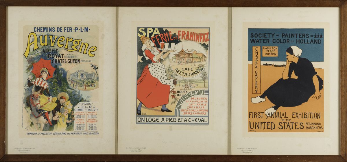 Tre apprezzabili esempi dell’arte cartellonistica del Fin-de-siècle, tratti dalla celebre serie dei “Maitres de l’affiche”.