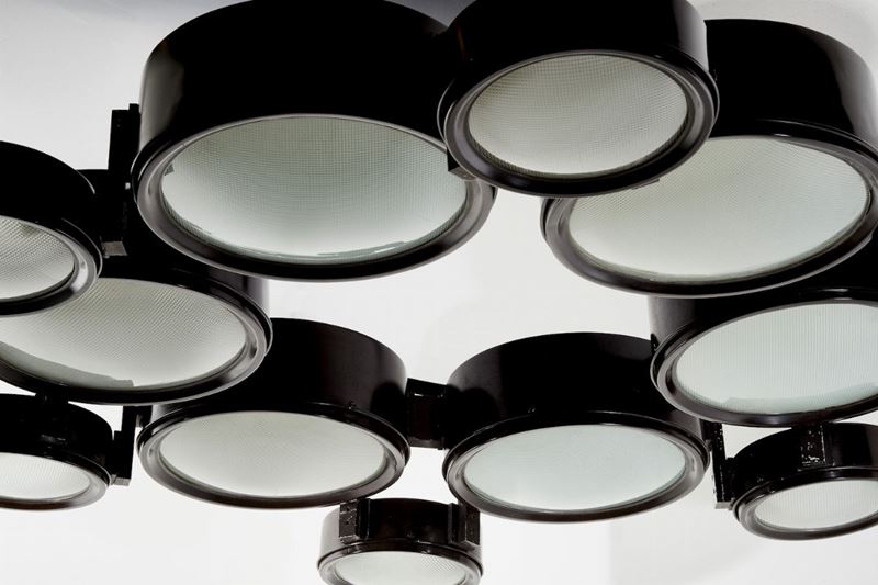 o a sospensione mod 2045/a in alluminio laccato e vetro.