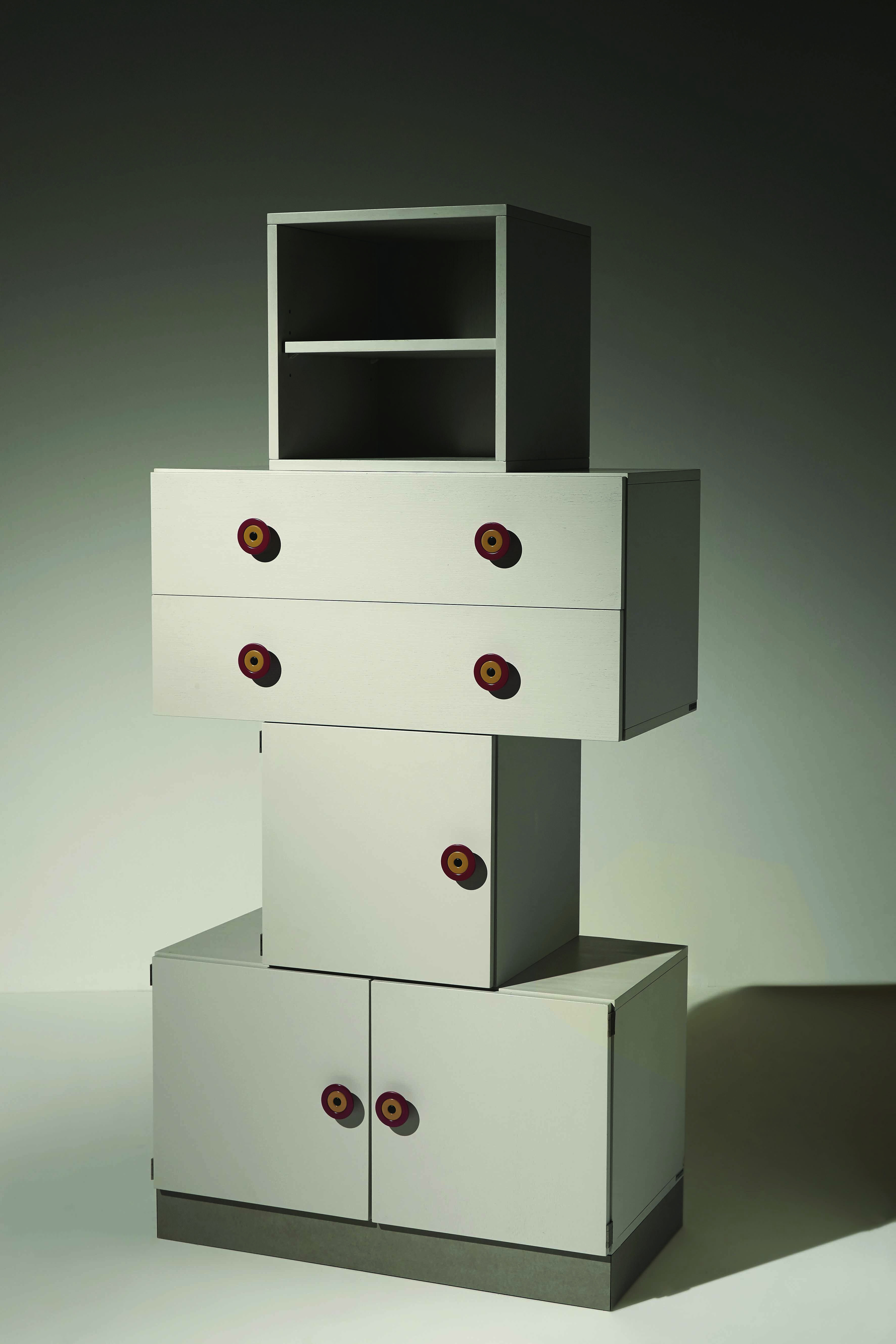 Mobile contenitore modulare della serie Kubirolo con struttura in legno laminato e legno laccato.