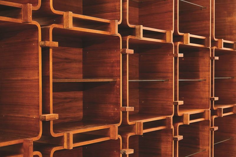Rara libreria modulare in legno compensato curvato. Piani in legno e vetro.