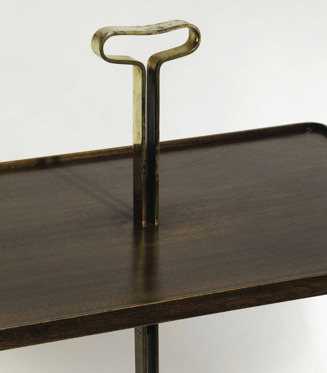 Tavolino da salotto con maniglia e sostegno in ottone. Piano in legno.