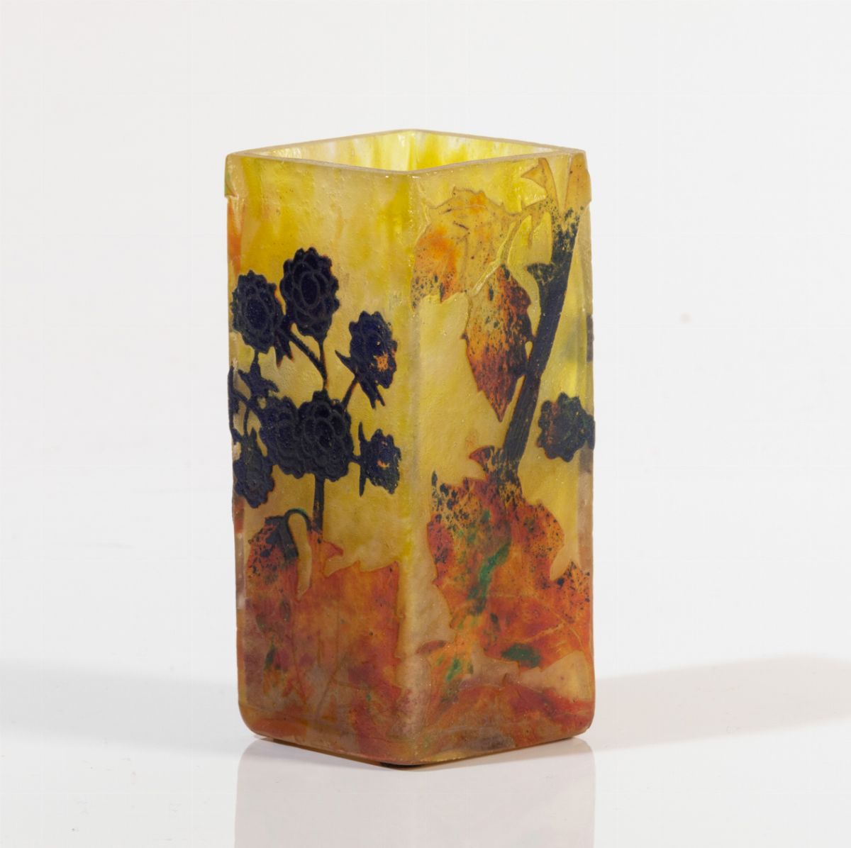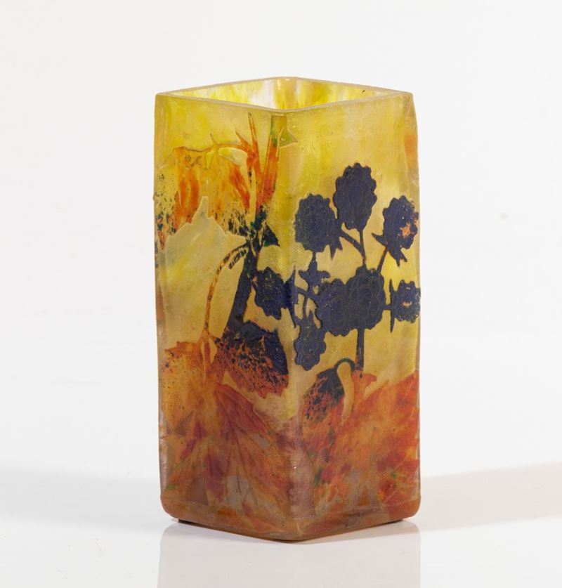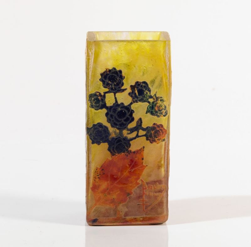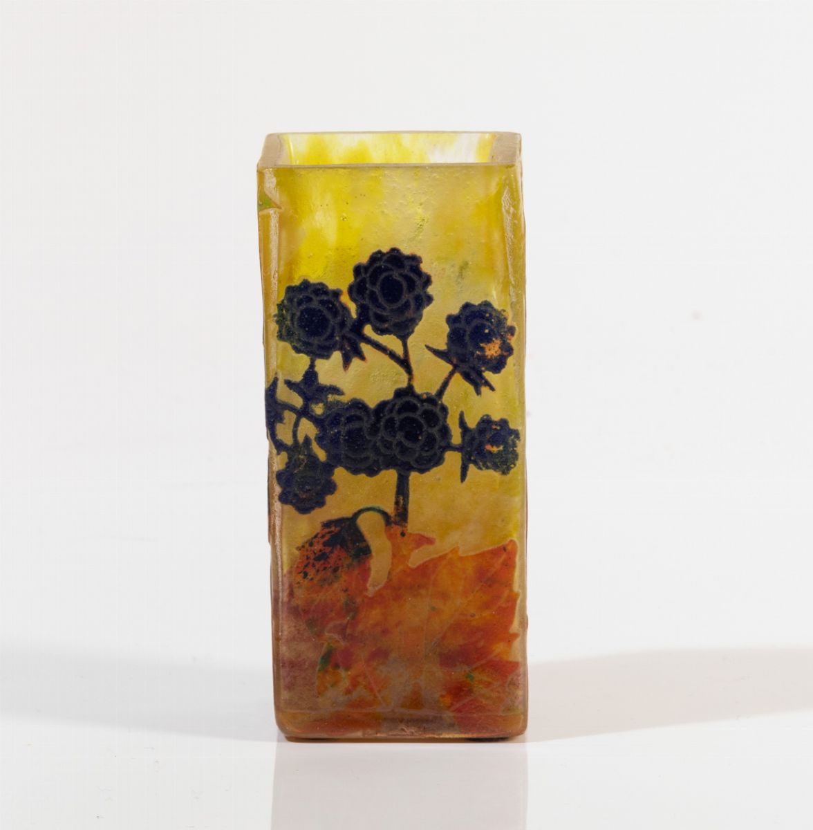 Vaso a parallelepipedo in vetro a cammeo con decoro di rovi.
