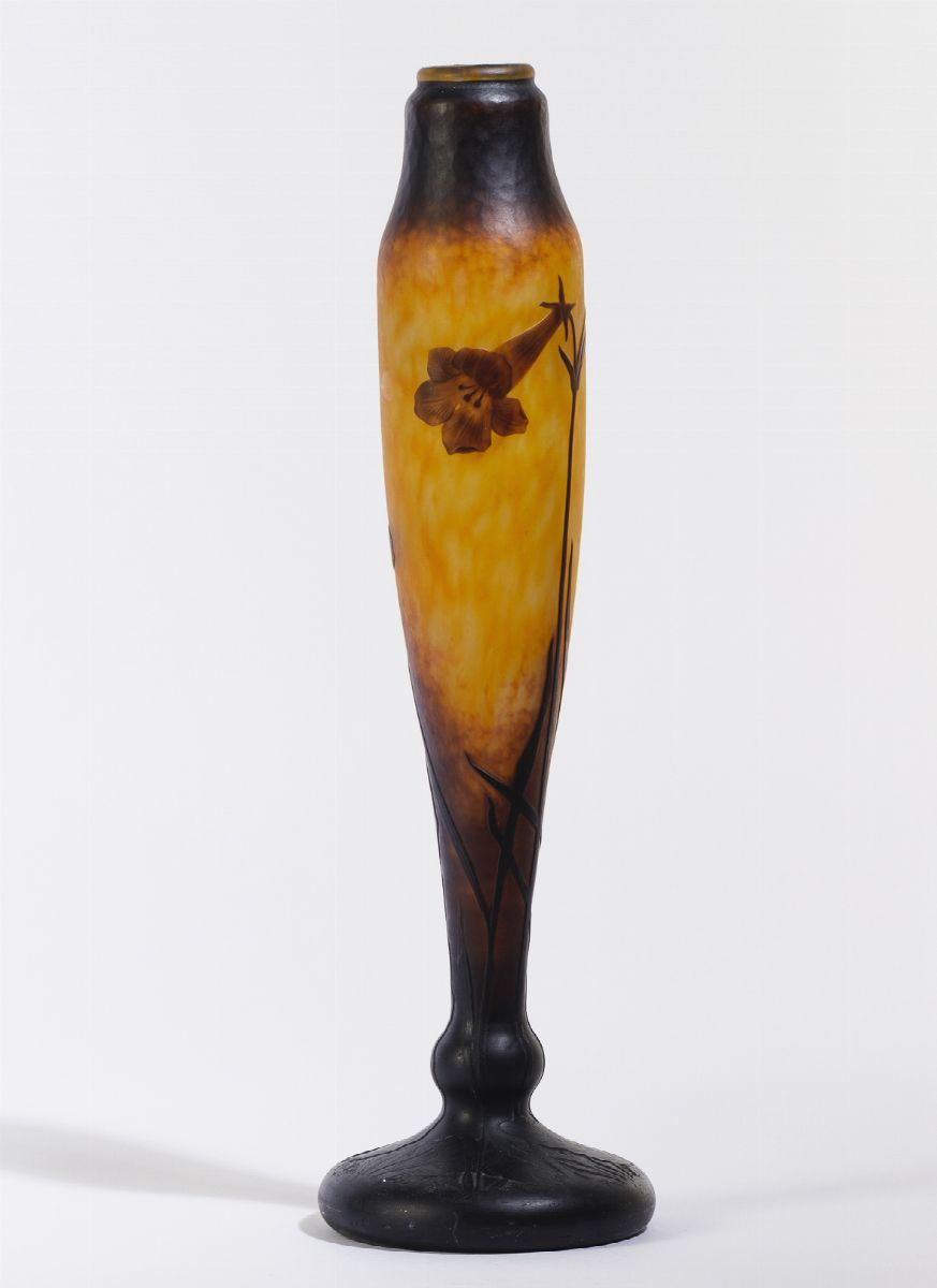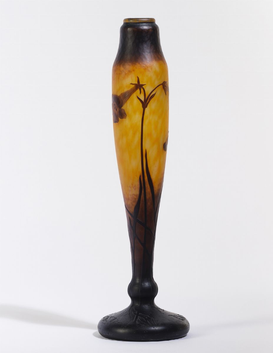 Vaso a balaustro su piede a bulbo in vetro a cammeo con decoro di tuberose.