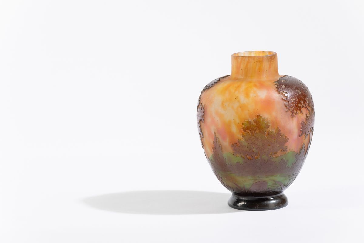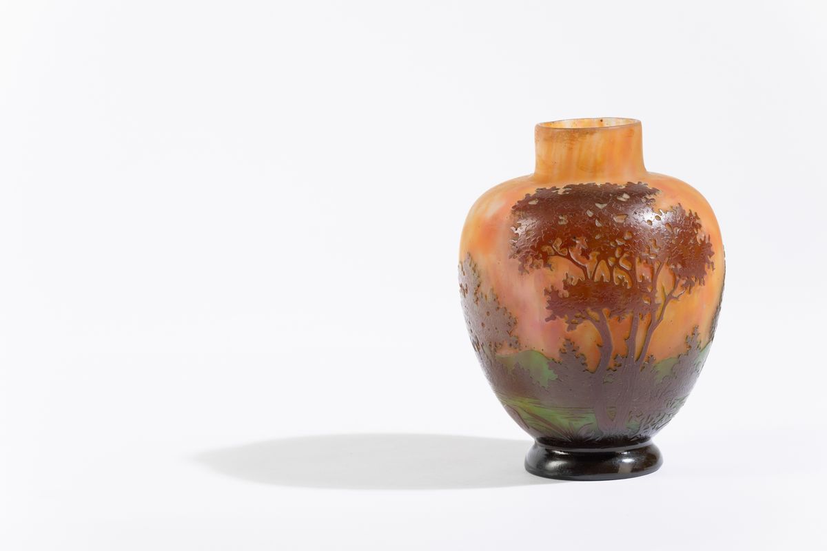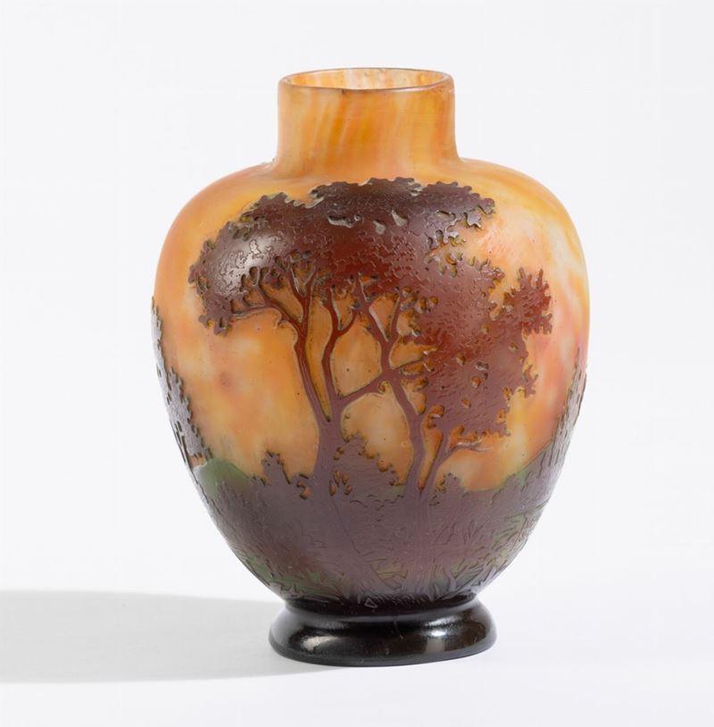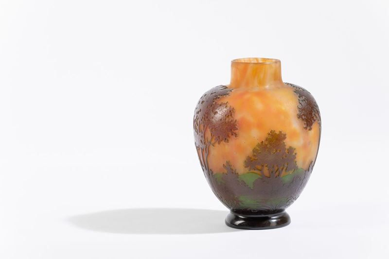 Vaso a uovo con collo cilindrico in vetro soffiato con decoro di paesaggio a cammeo.