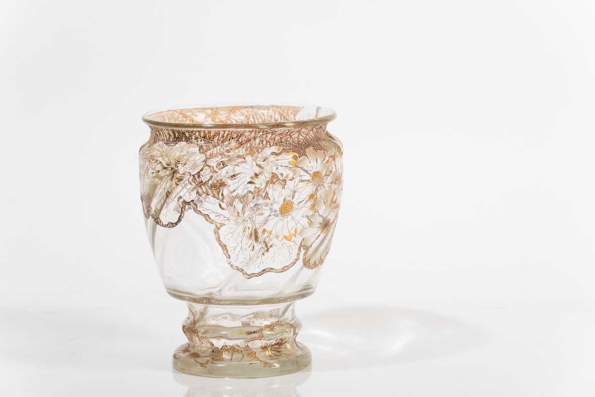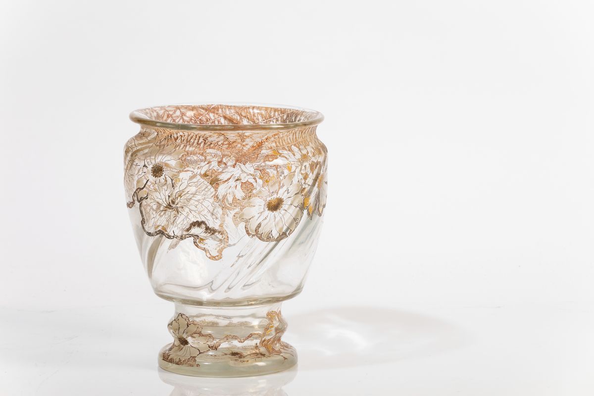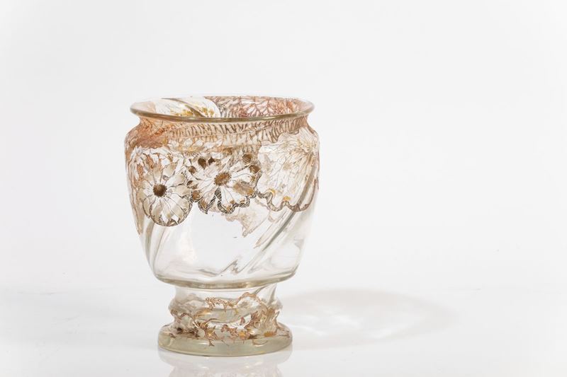 Eccezionale vaso in cristallo soffiato in stampo torcadé con decoro inciso di fiori e ragnatele a smalti e dorature.