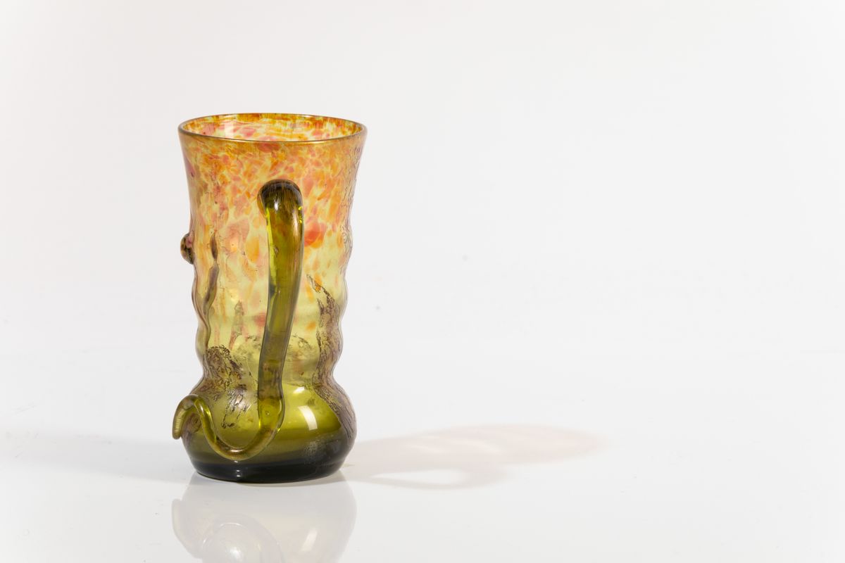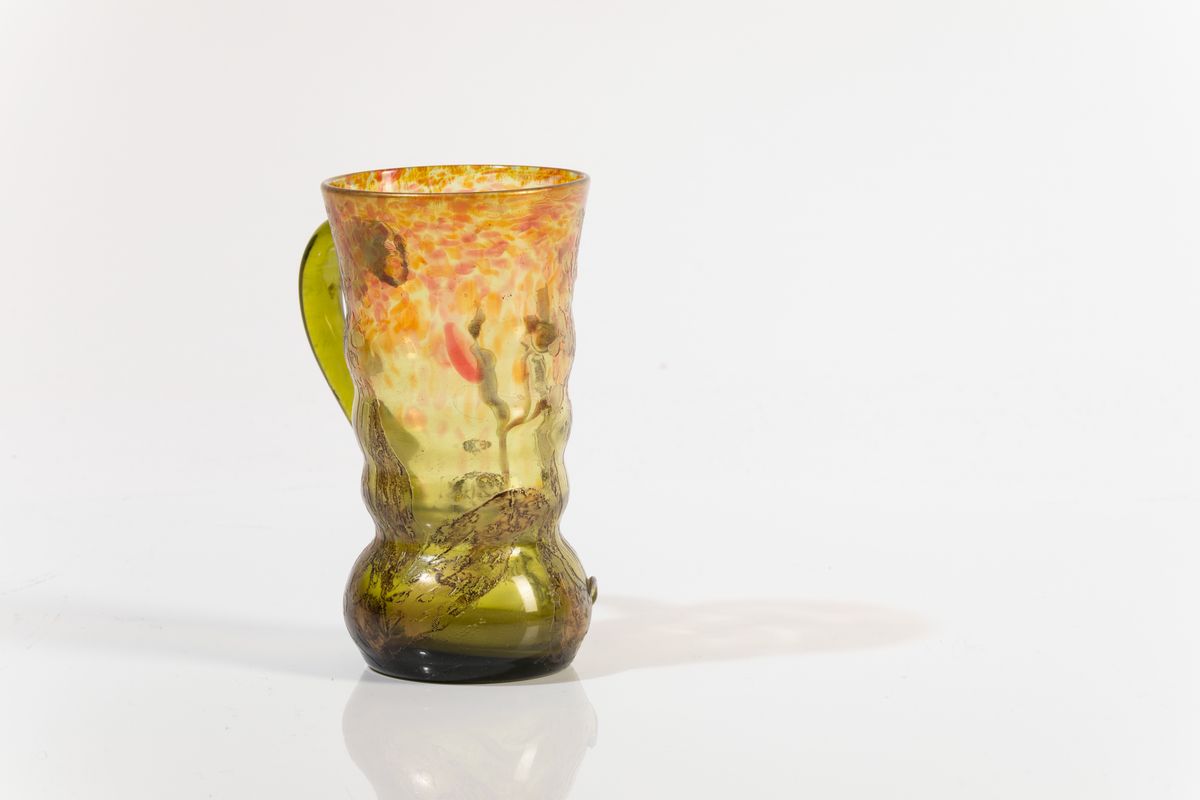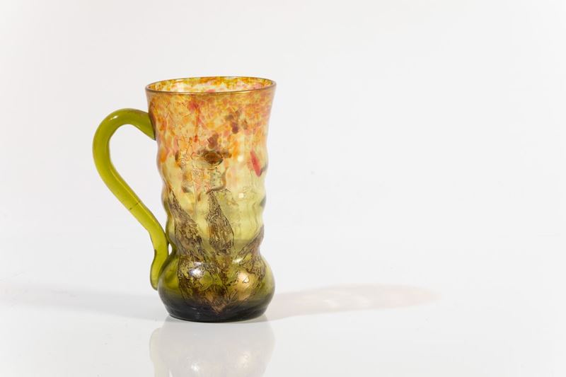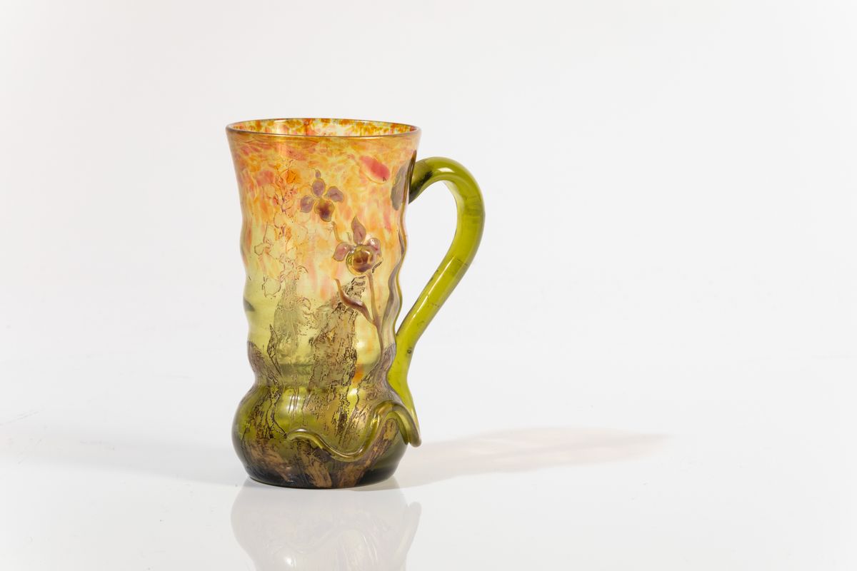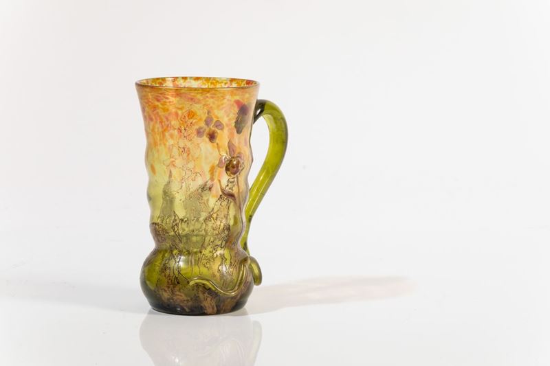 Raro boccale in vetro soffiato con ansa serpentiforme e decoro floreale inciso e a cammeo, con smalti e dorature.