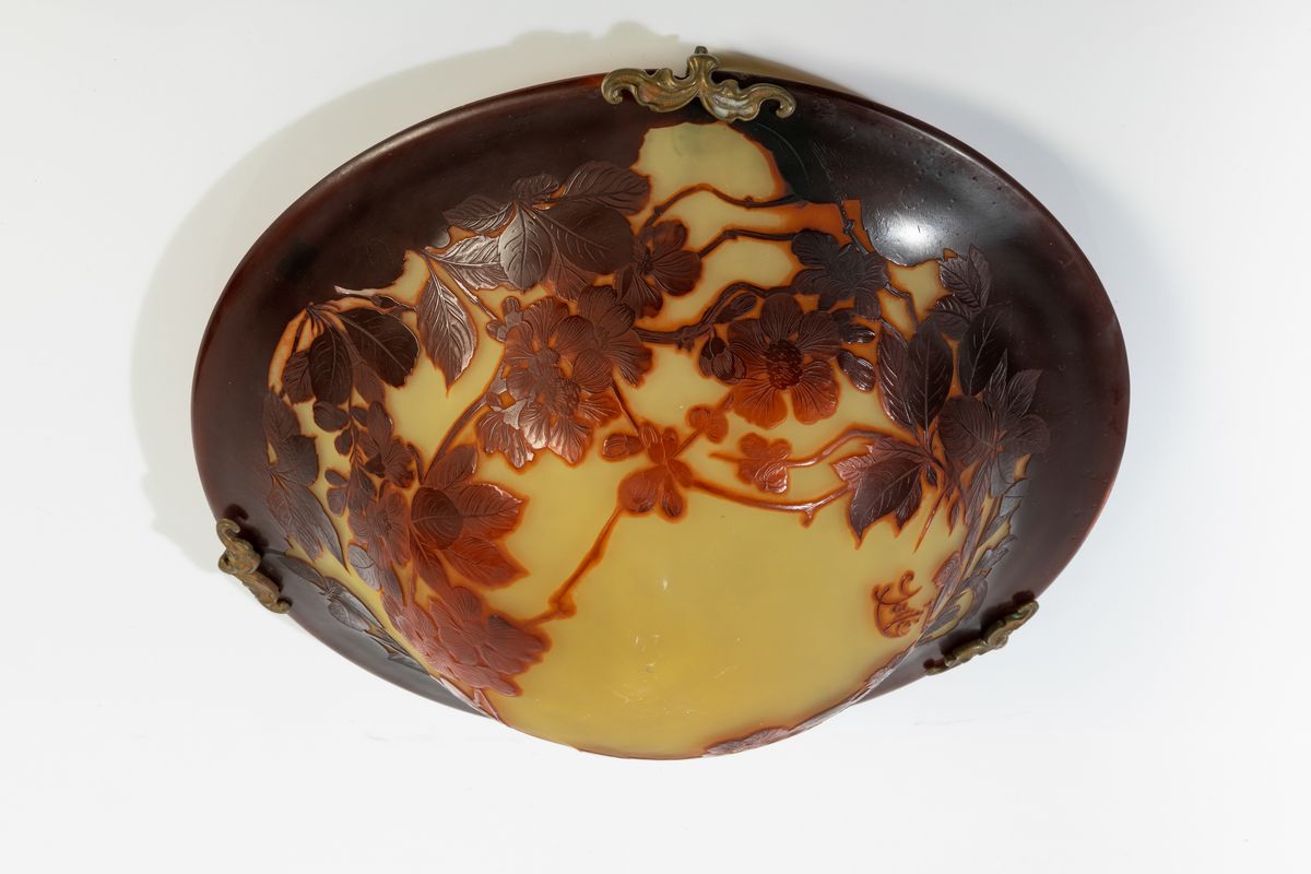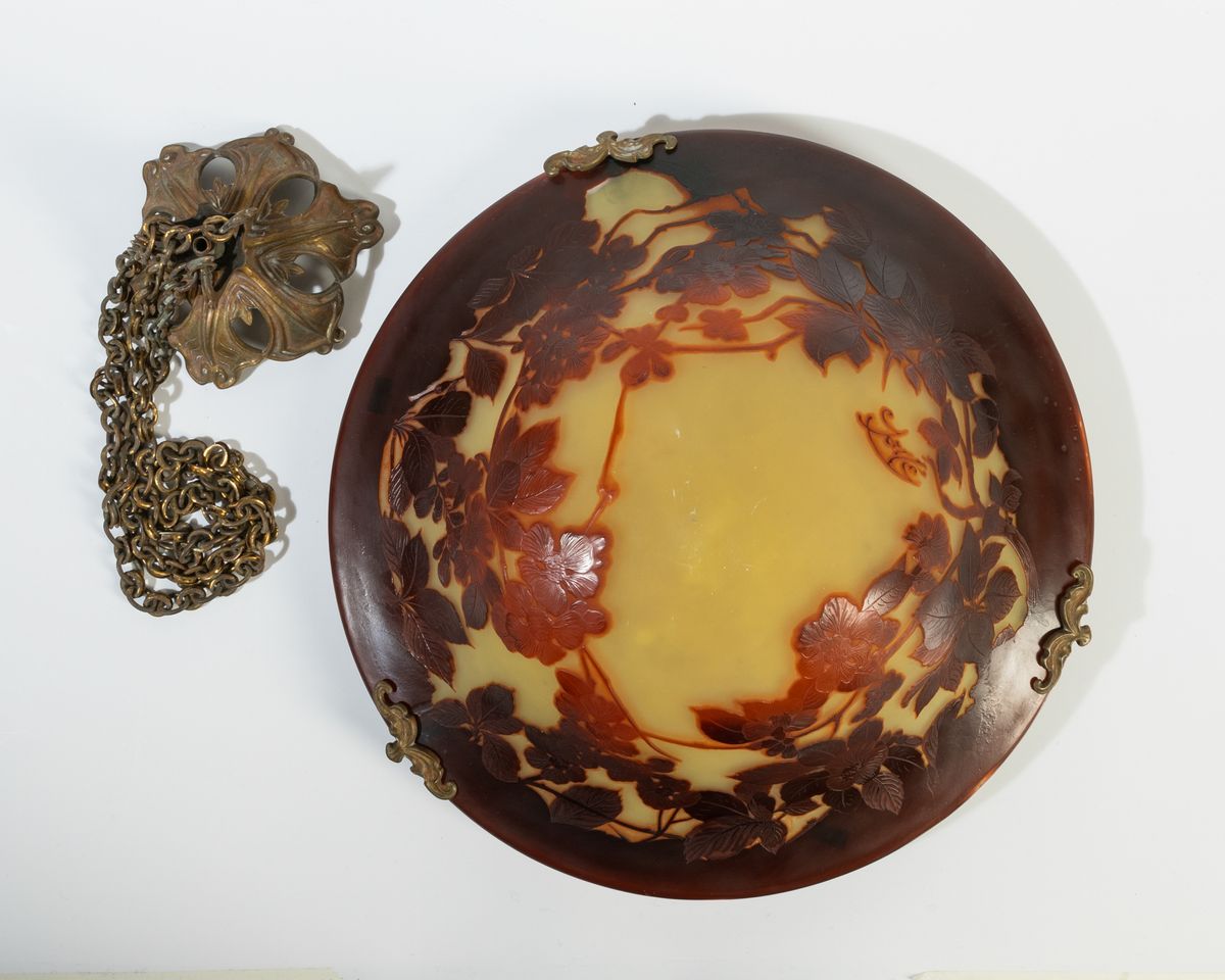 Lampadario formato da coppa in vetro a cammeo con decoro floreale. Montatura e catene in ottone dorato.