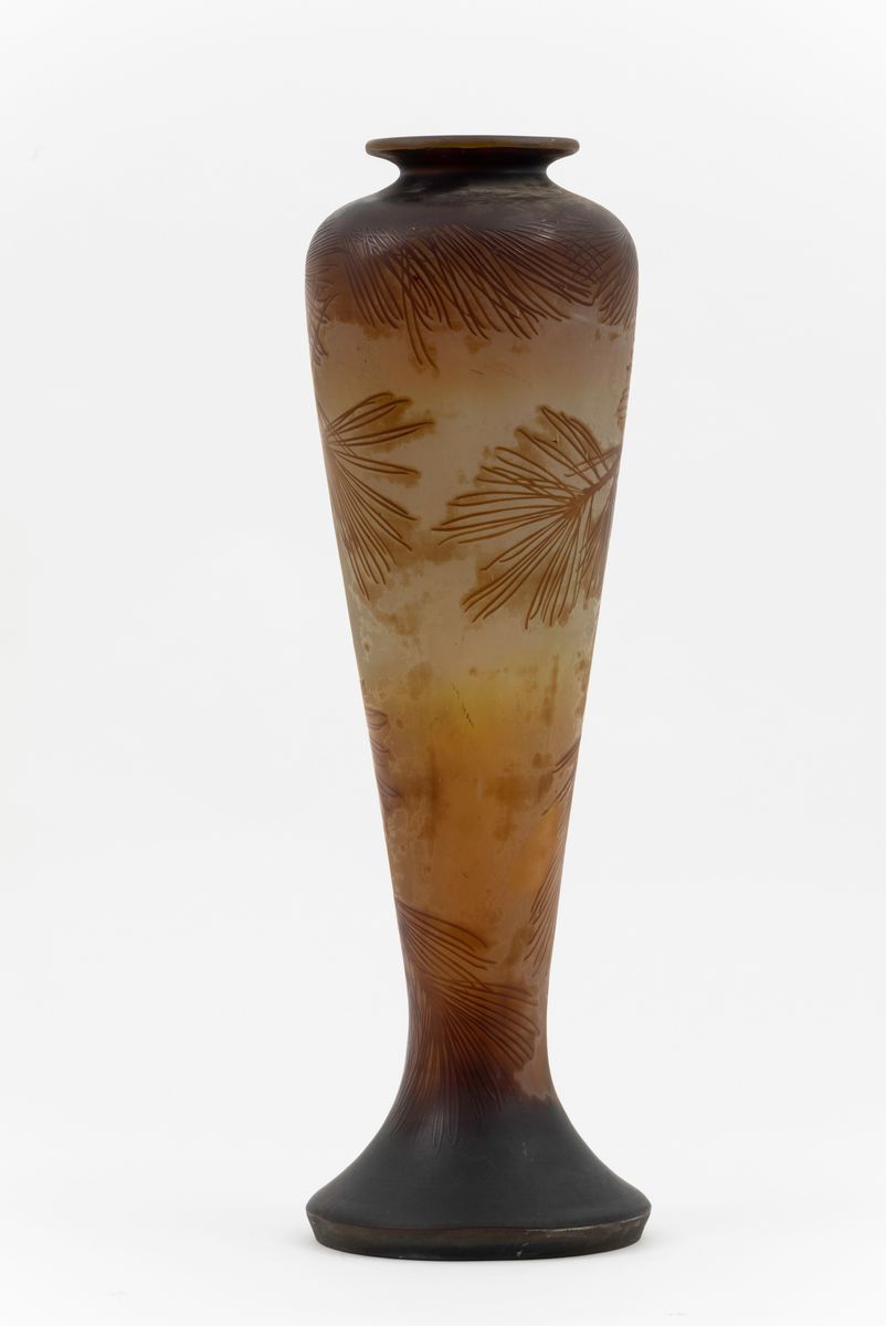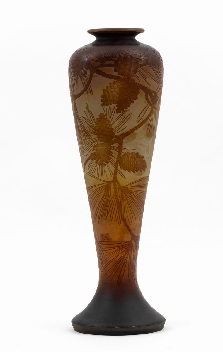 Monumentale vaso ovale a balaustro in vetro a cammeo con decoro di rami di pino e pigne.